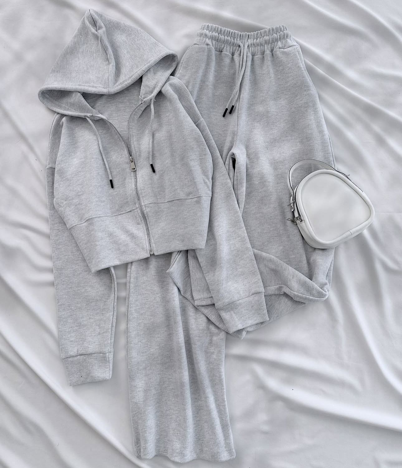 Açık Gri Selanik Kumaş Kapüşonlu Takım