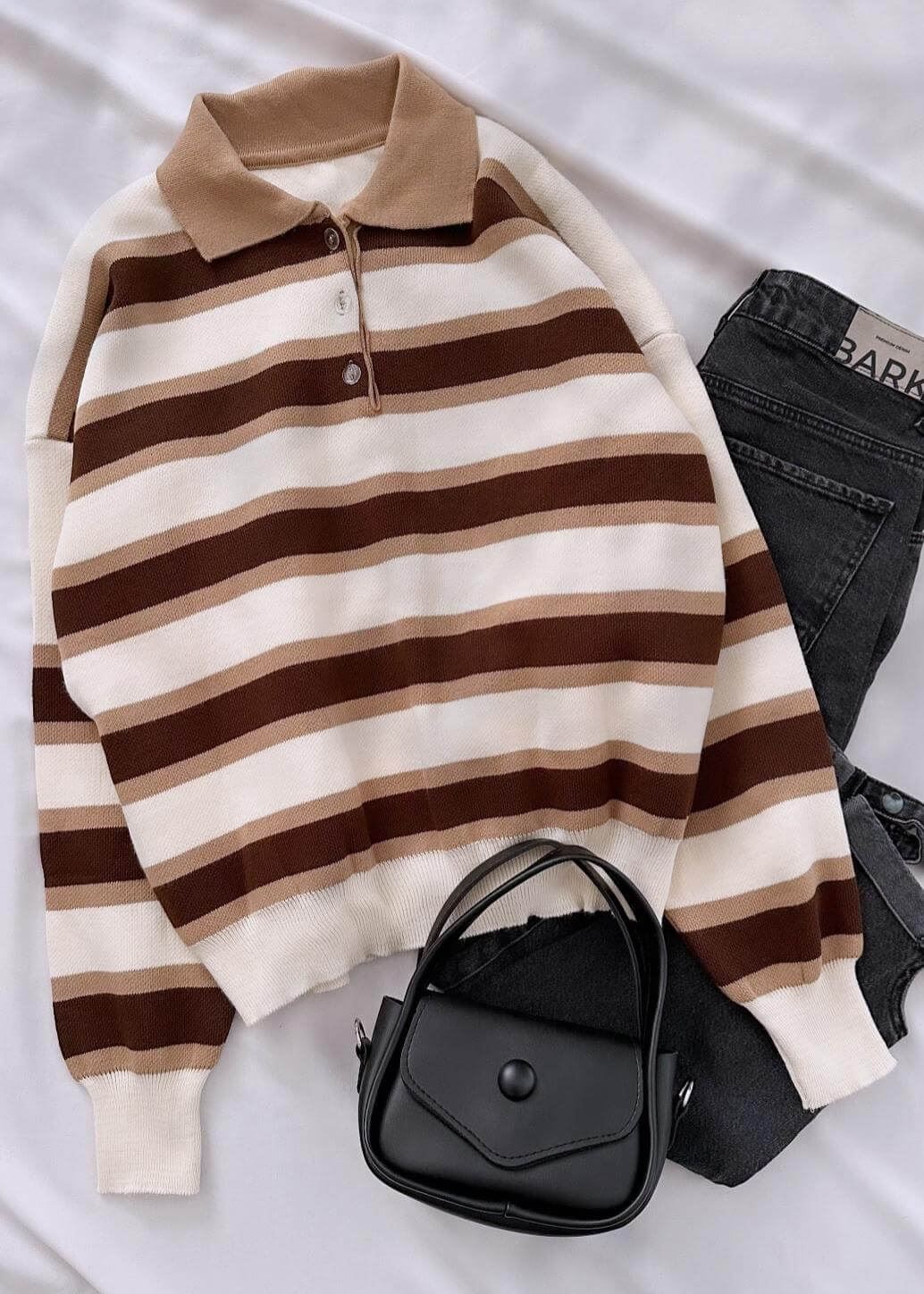 Bej Çizgili Polo Yaka Kazak