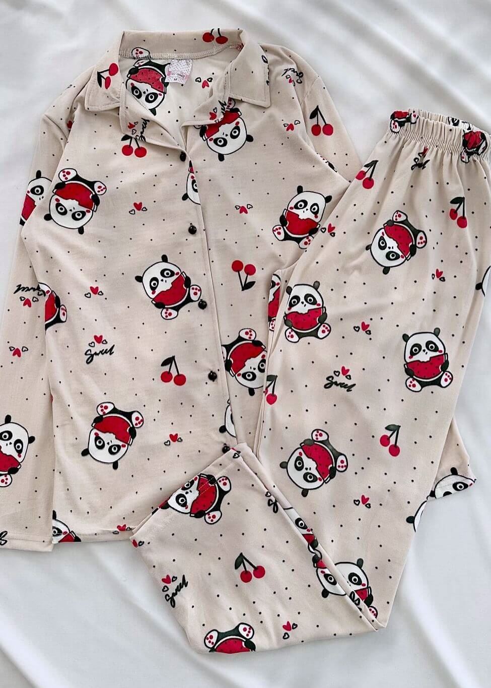 Bej Panda Desen Pijama Takımı