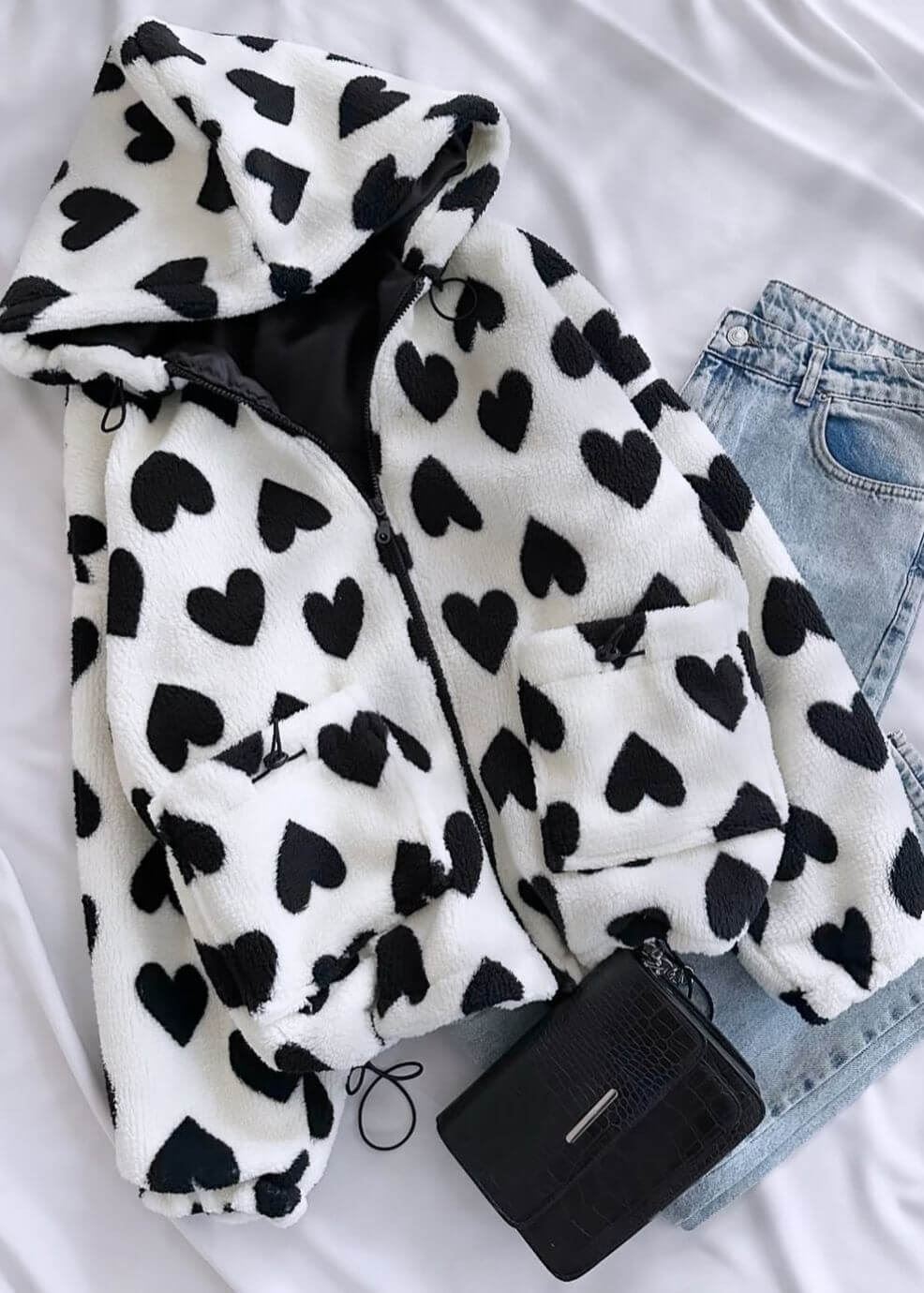 Beyaz Kalp Detay Astarlı Peluş Ceket