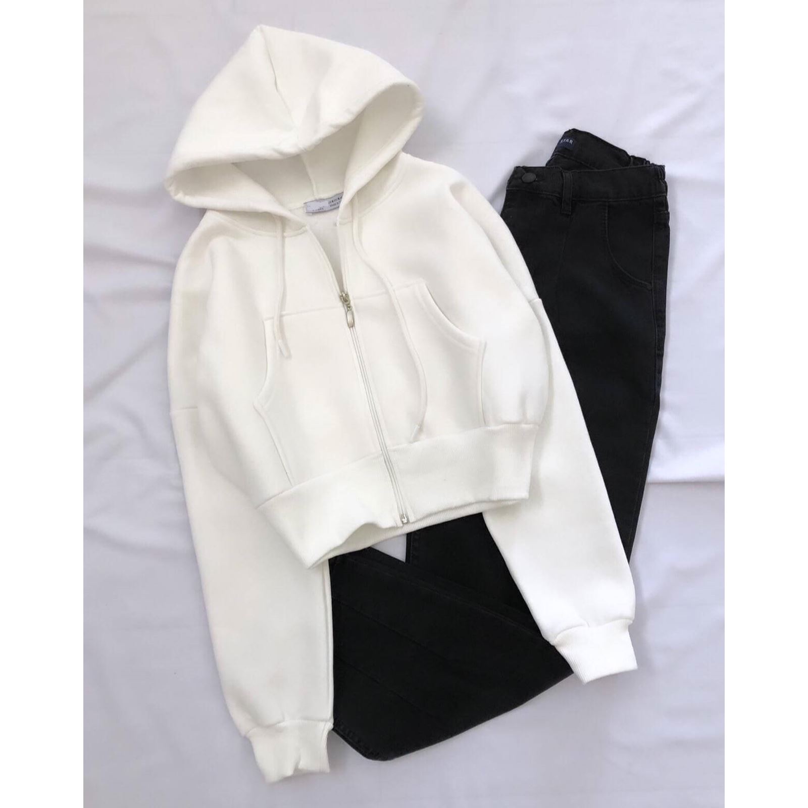 Beyaz Kapüşonlu 3 İplik Crop Ceket