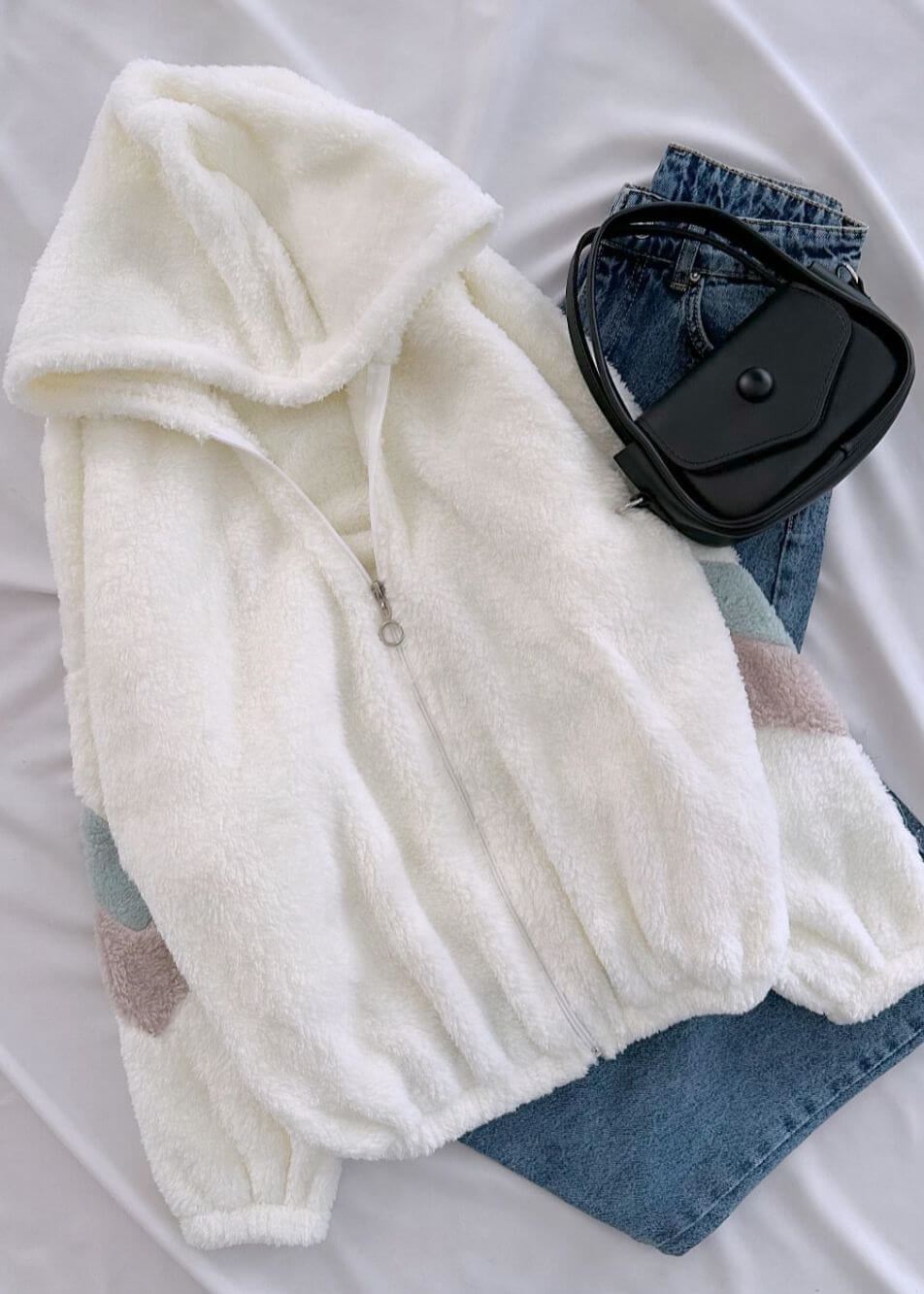Beyaz Kalp Detay Astarlı Peluş Ceket