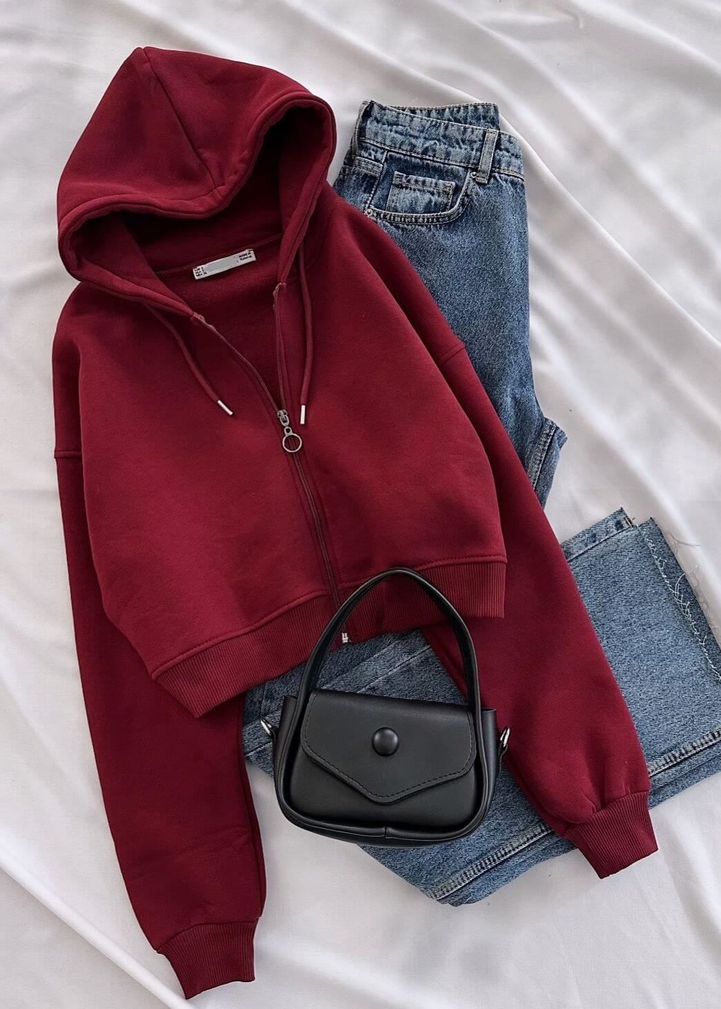 Bordo Kapüşonlu Kısa Ceket