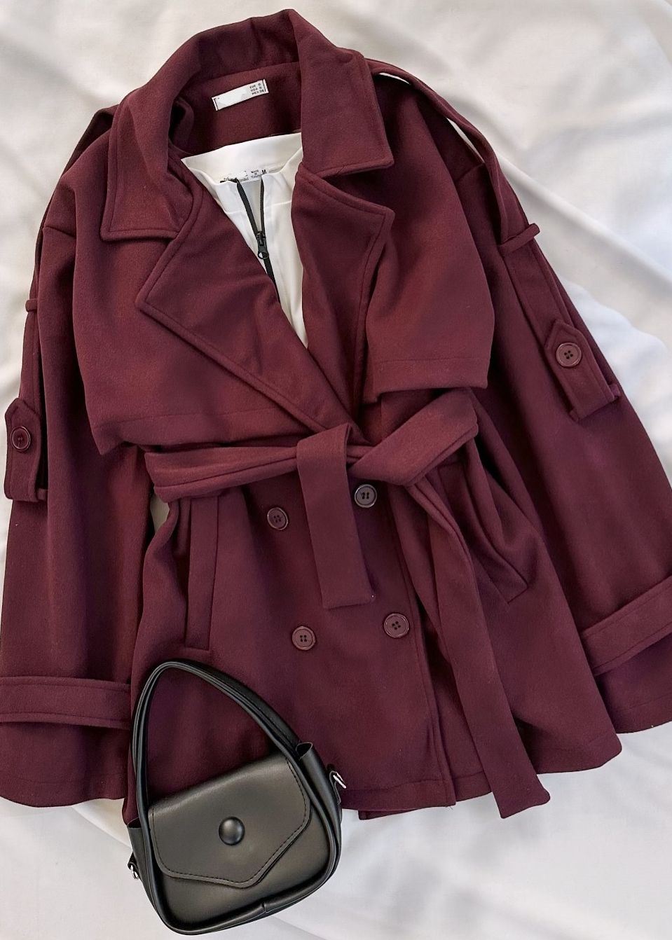 Bordo Kaşe Bağlama Detay Trenç Ceket