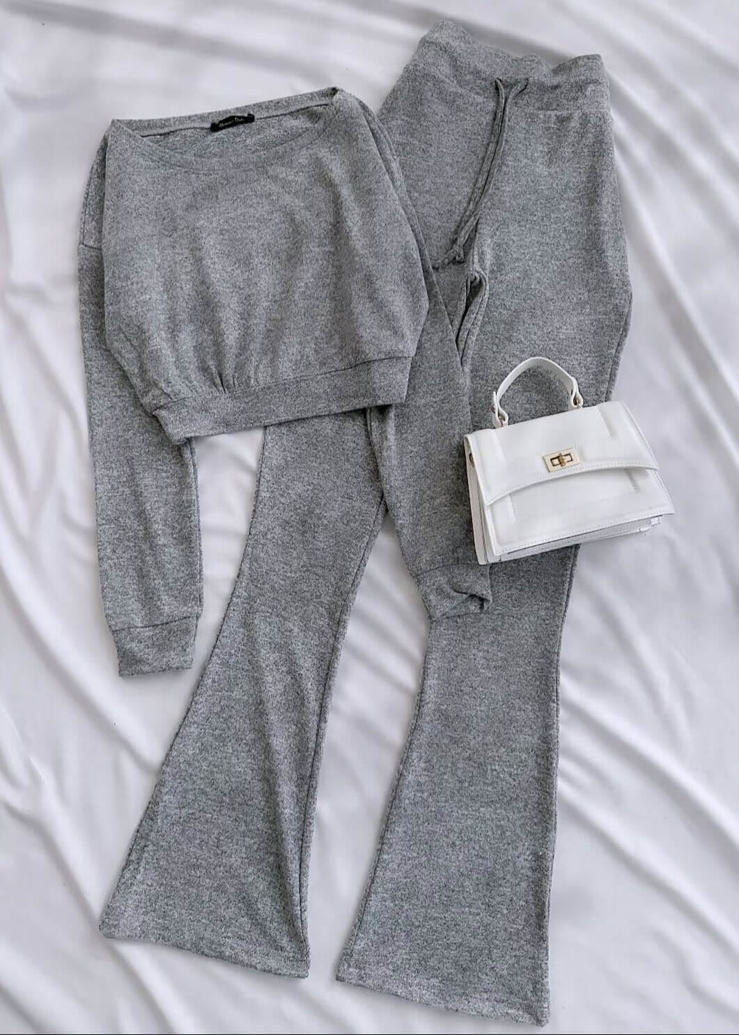 Gri Yumoş Kayık Yaka İspanyol Paça Takım