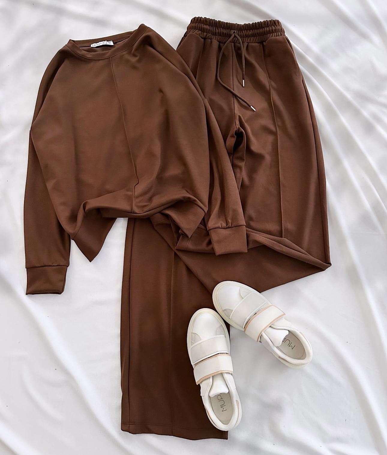 Kahverengi Dokulu Kapüşonlu Ceket Pantolon Takım