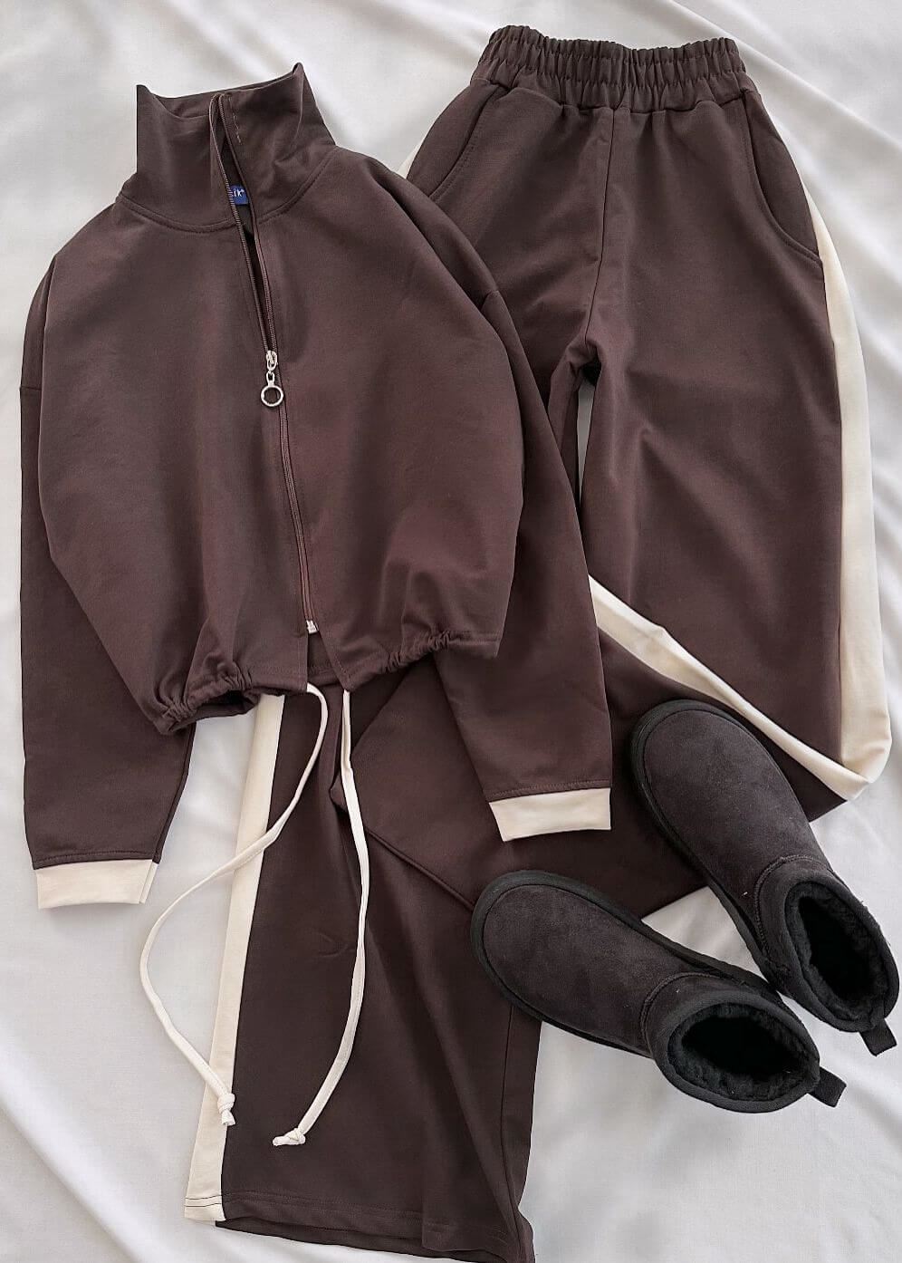 Kahverengi Büzgü Şerit Eşofman Takımı