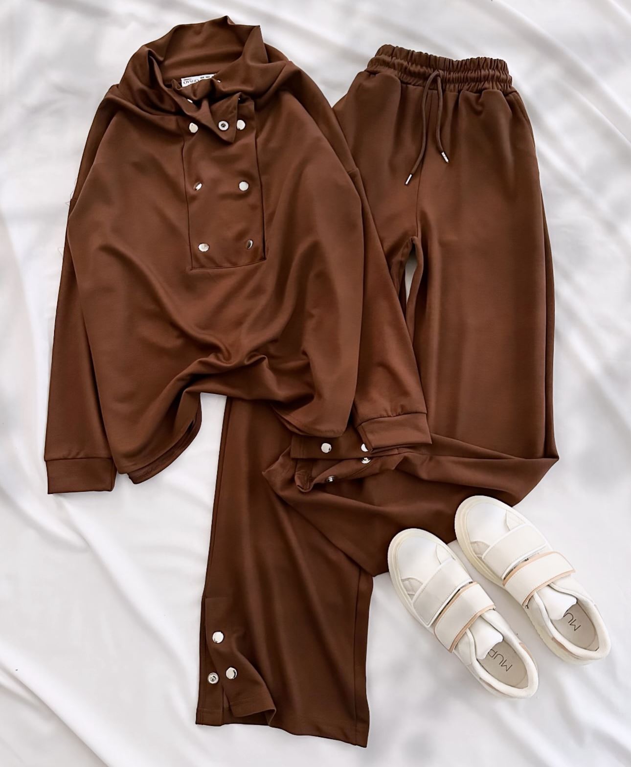 Kahverengi Ön Yaka Detay Modal Kumaş Takım