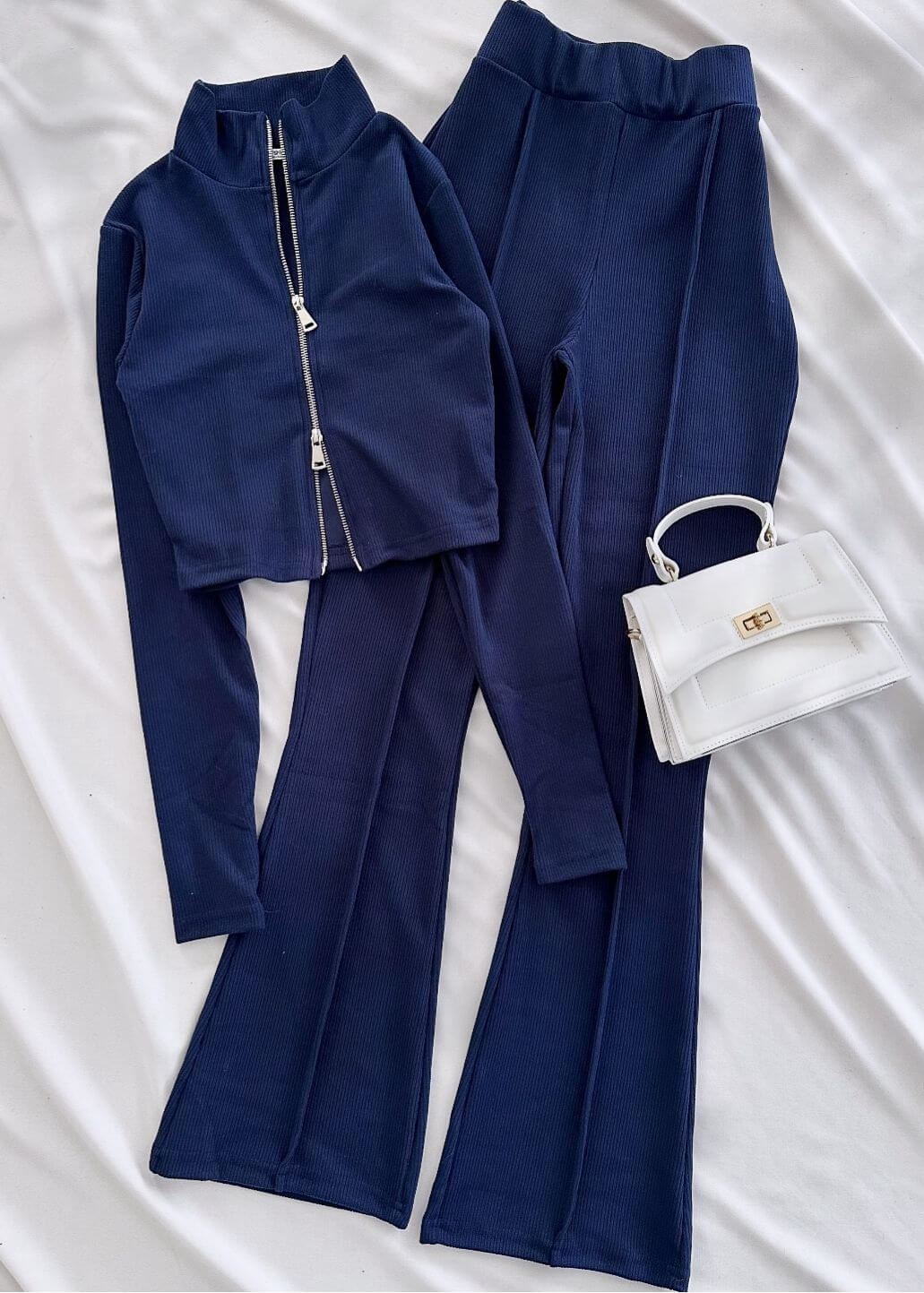 Mavi Çift Fermuar Detay Selanik Kumaş Takım
