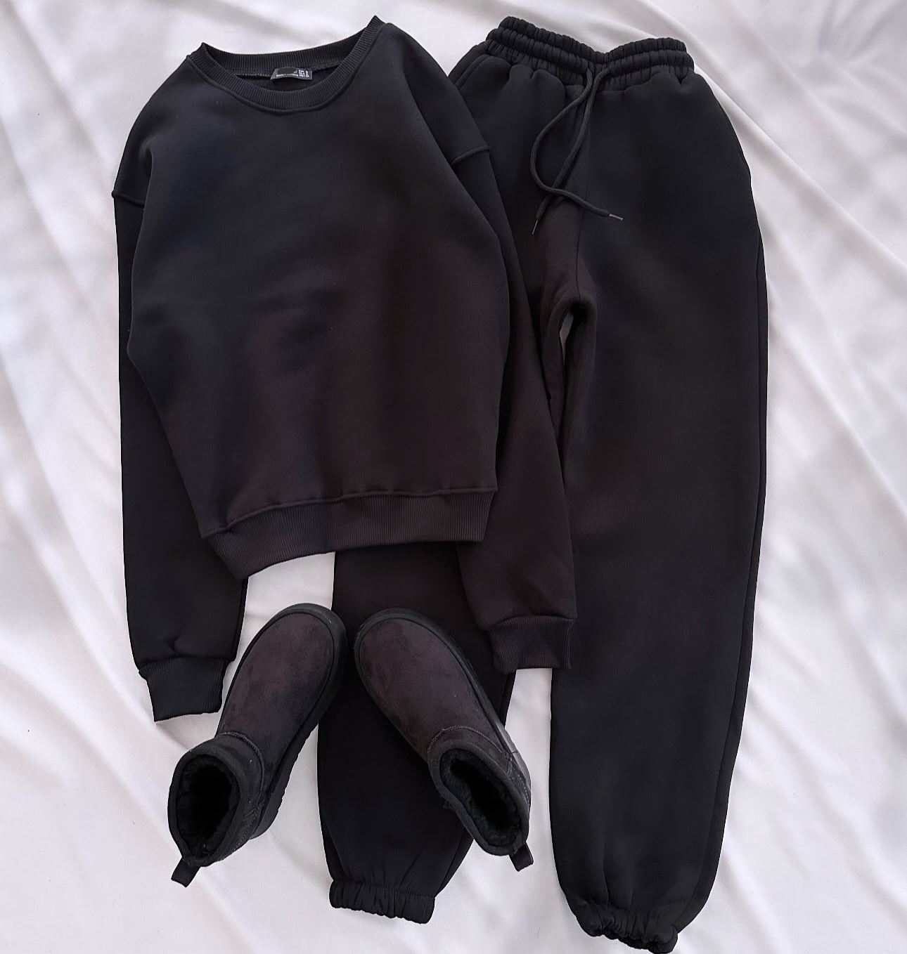 Siyah Bel Detay 3 İplik Eşofman Takımı