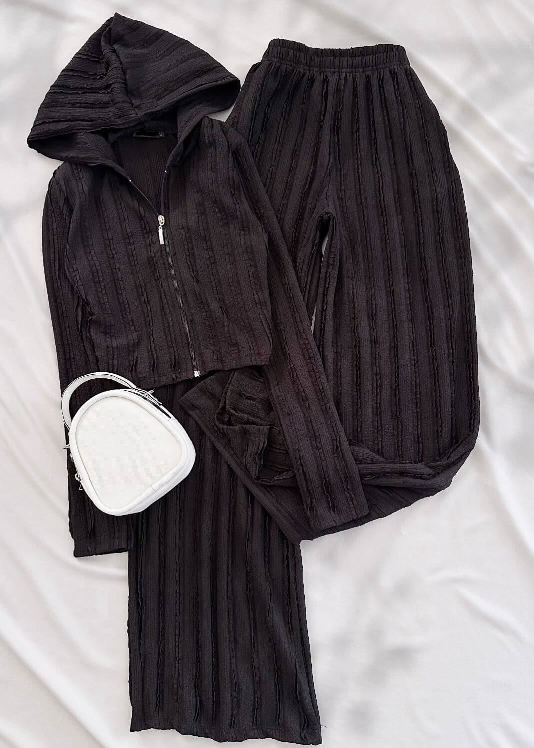 Siyah Dokulu Kapüşonlu Ceket Pantolon Takım