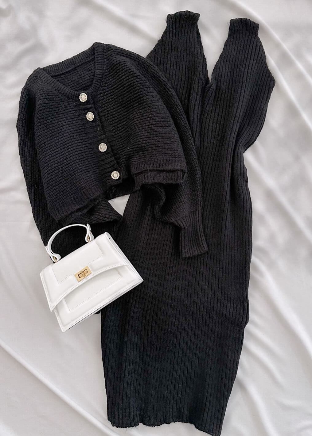 Kahverengi Düğme Detay Hırka Elbise Takım