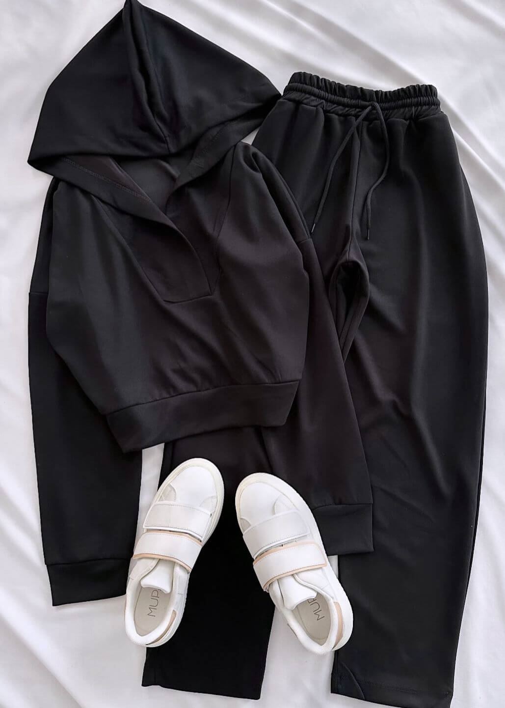 Siyah Oysh V Kapüşonlu Eşofman Takımı