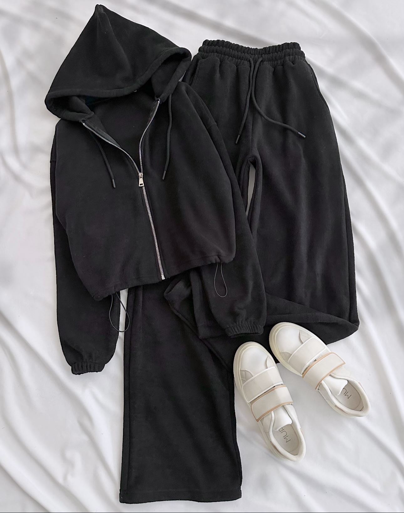 Siyah Uzun Kol Düğme Detay V Bluz Pantolon Takım