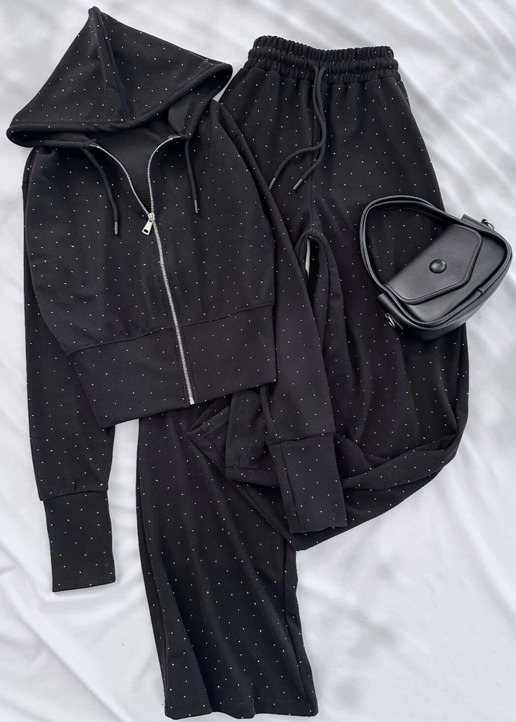 Siyah Dokulu Kapüşonlu Ceket Pantolon Takım