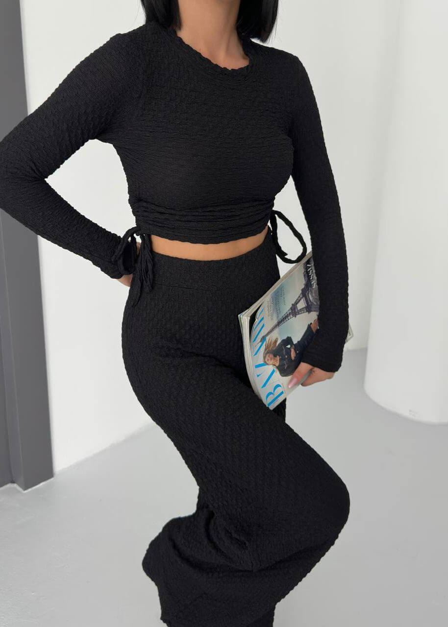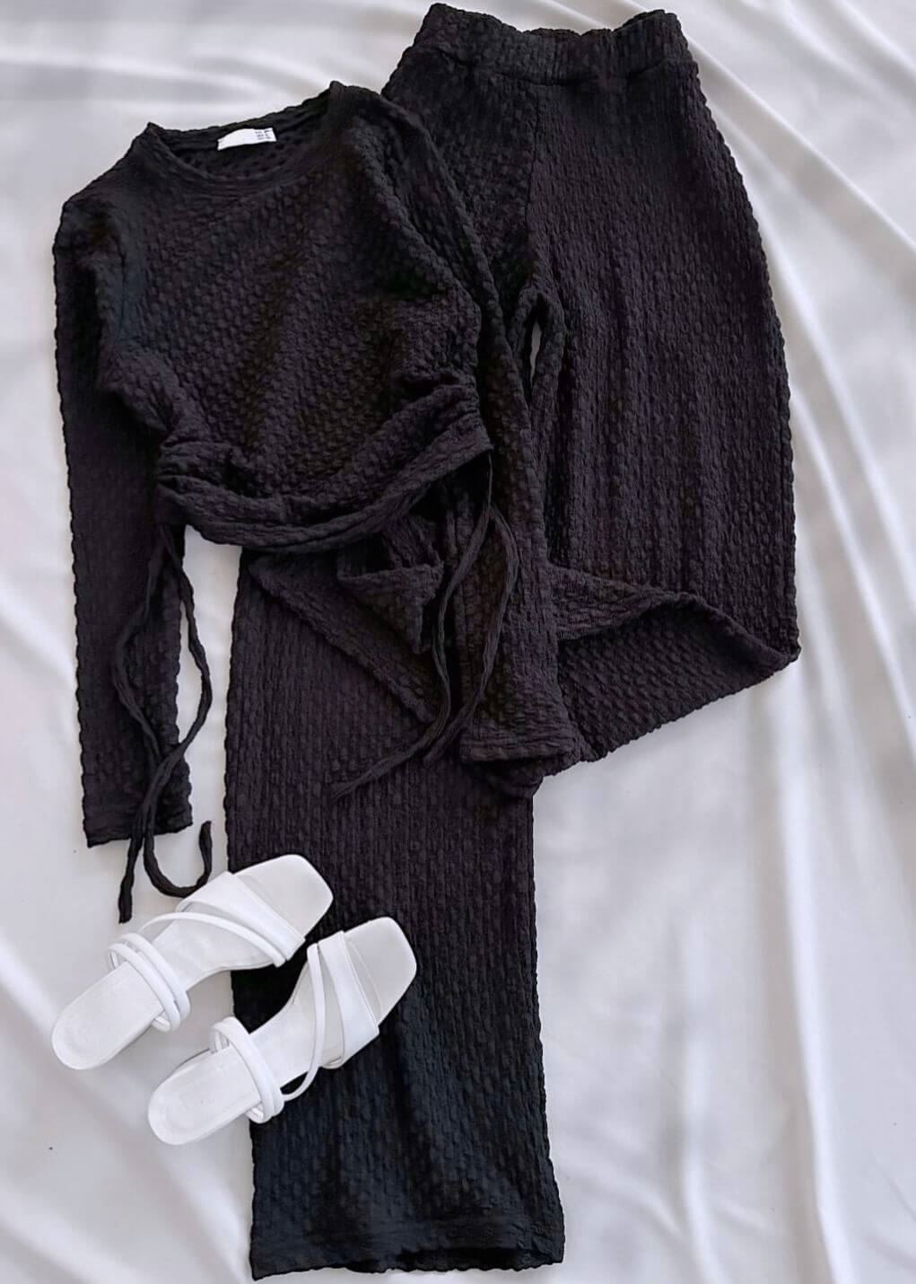 Siyah Uzun Kol Yan Büzgü Gofre Takım