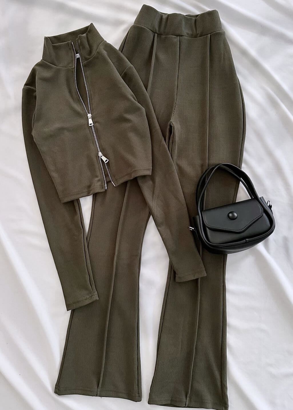 Yeşil Çift Fermuar Detay Selanik Kumaş Takım