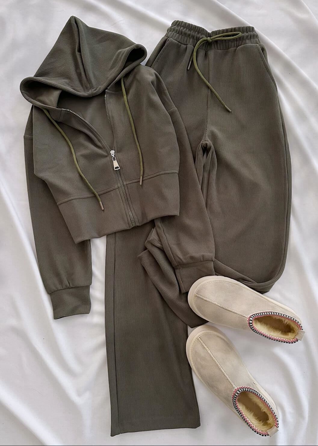 Yağ Yeşili Madonna Yaka Gofre Takım